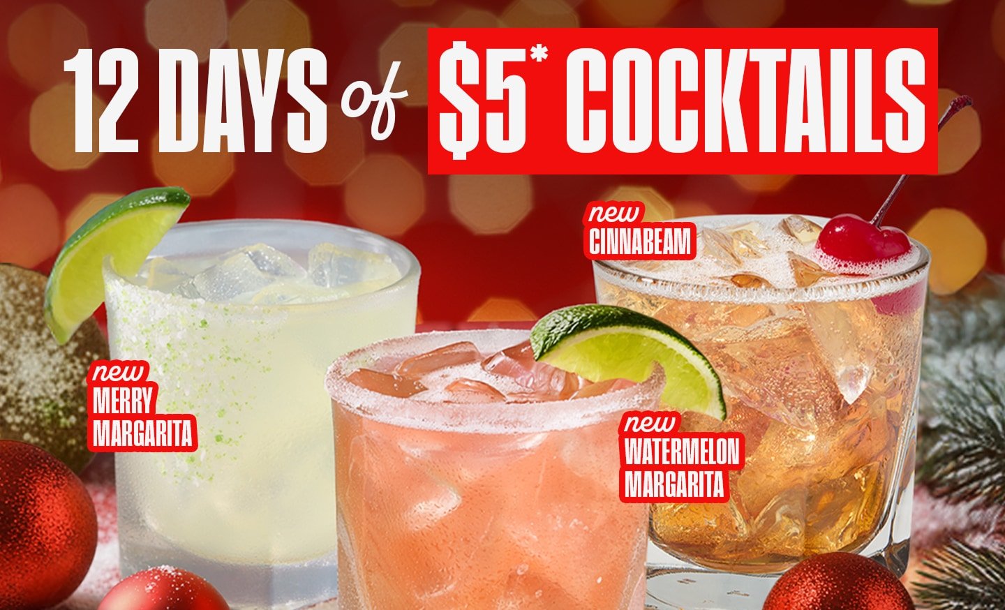 Try our NEW cocktails, the tangy Merry Margarita, fruity Watermelon Margarita and bold Cinnabeam, that are only $5* for a limited time.